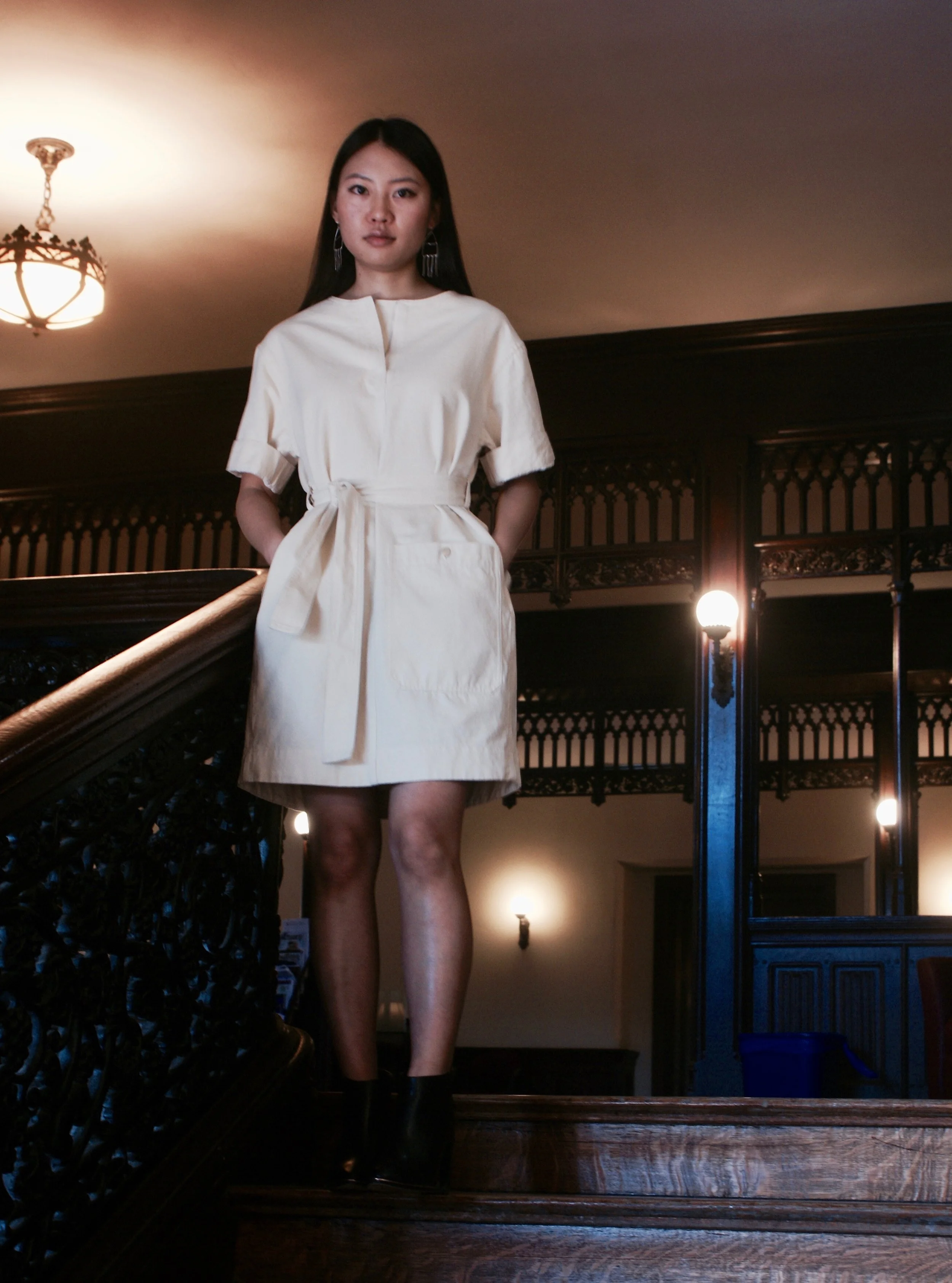 A canvas dress from Uniqlo’s Uniqlo U line. I liked that the neckline and the pocket made it look a little 60’s retro. The boots are Ted Baker. Every year or two I buy a new pair with a slightly higher heel but otherwise exactly the same. They’re just easy to wear since I’m lazy.