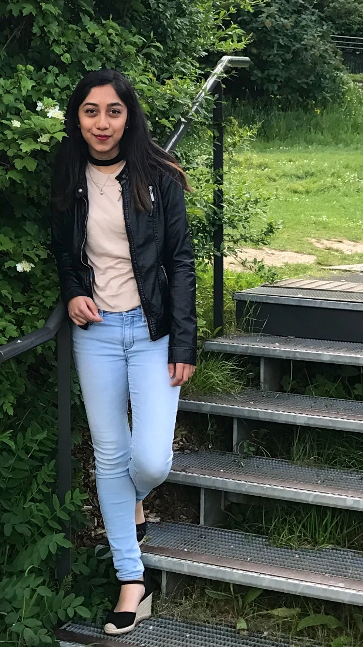 I’m wearing a beige Zara sweater, H&M leather jacket, and H&M wedges.