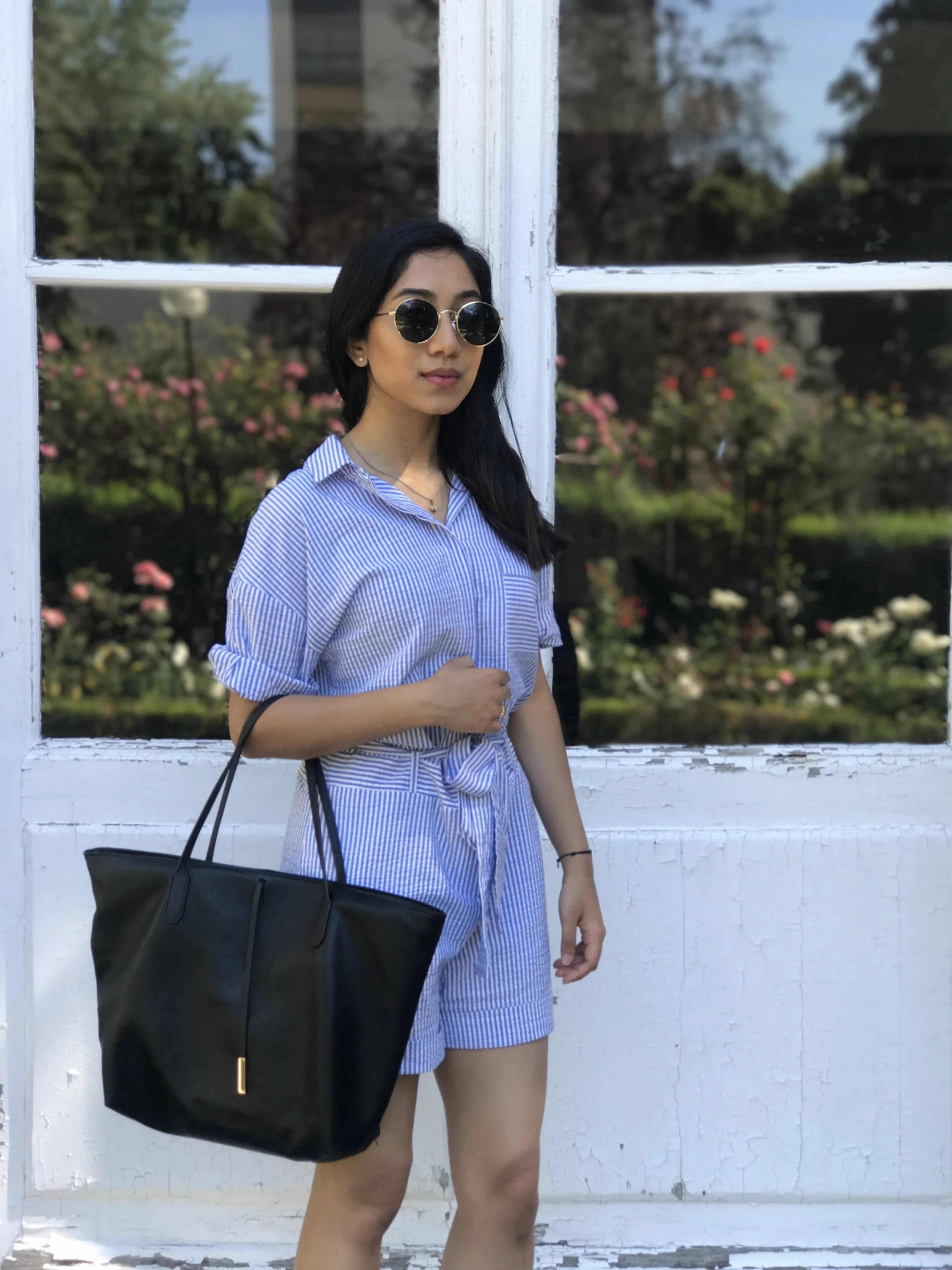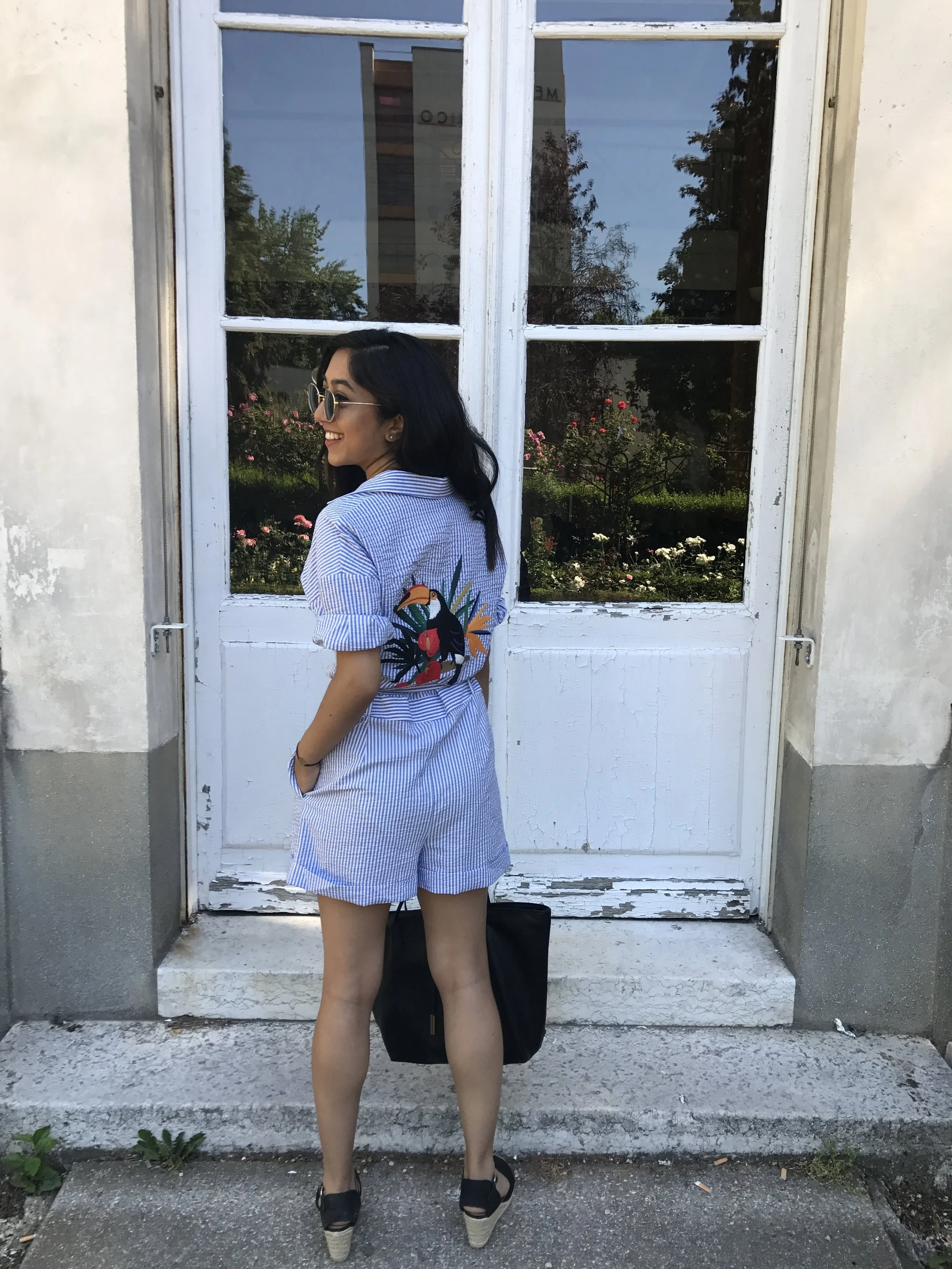 I’m wearing a blue and white seersucker romper from Zara, and the same H&M wedges.
