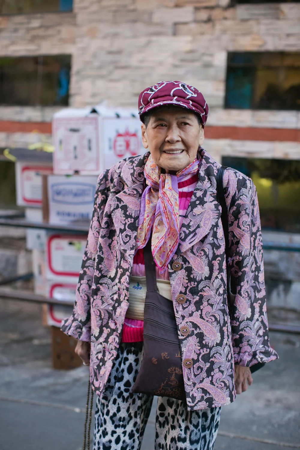 The page is visually striking due to the colorful nature of the subjects’ outfits as well as the backdrops they are photographed in front of. The portraits captured by Lo and Luu are cheery and bright, capturing the joy and wisdom of the elders they depict. Staples of the Chinatown Pretty style include bright colors, large hats, floral prints, and layers upon layers, with vests being a particularly popular choice of outerwear. The seniors’ style combines bold fashion statements with practicality: many of those documented are grocers and find fun ways to incorporate essential garments such as sleeve protectors into their outfits.