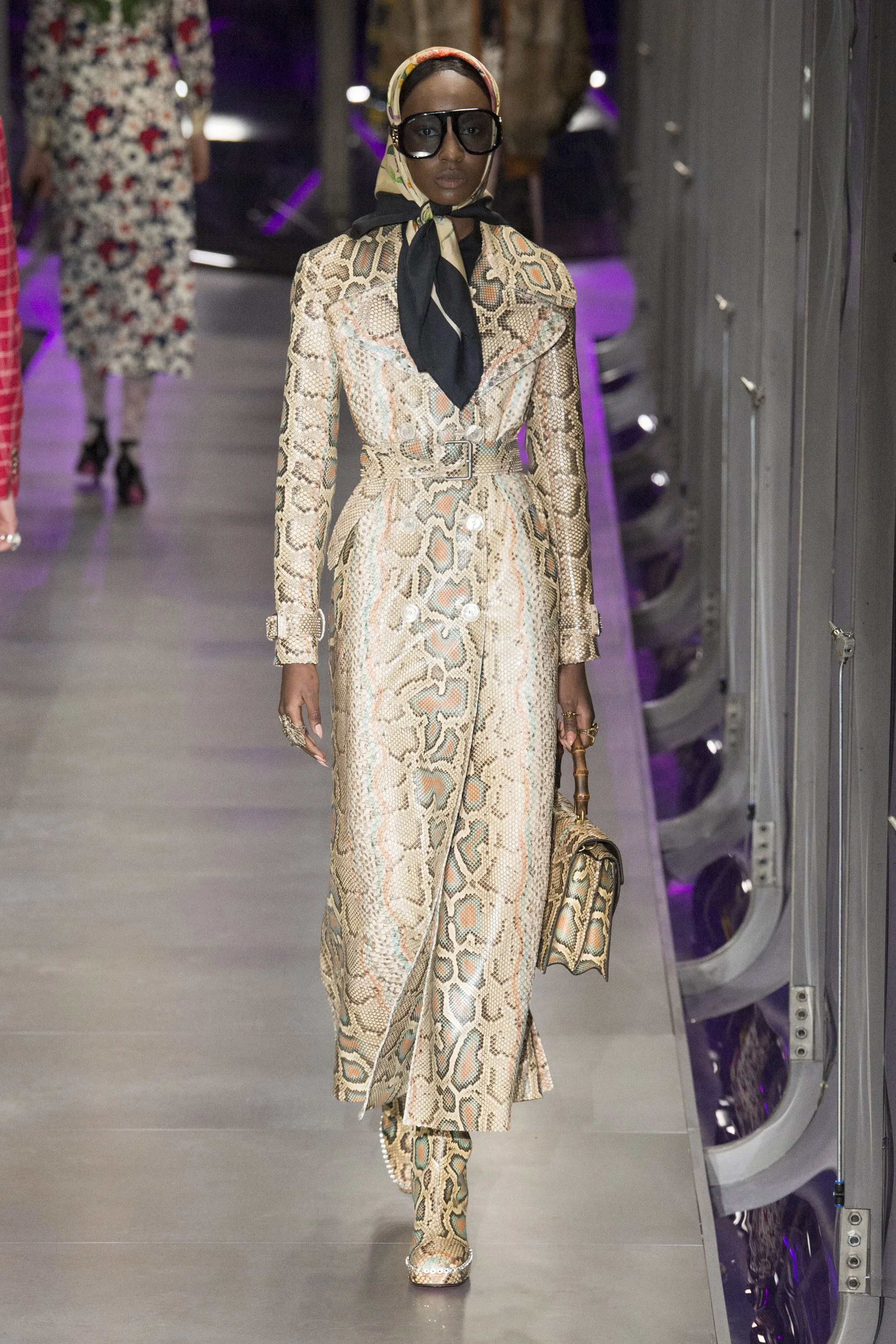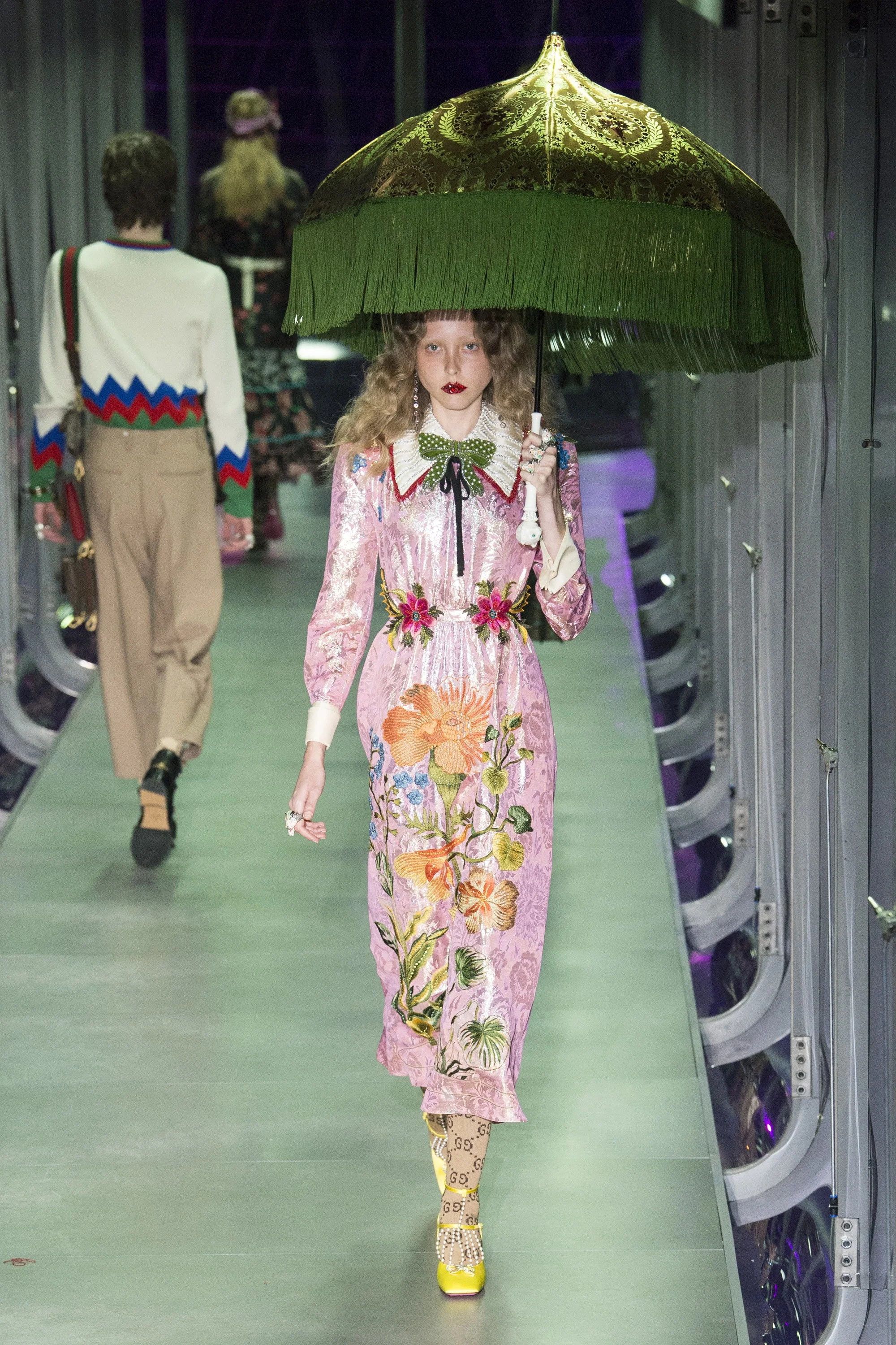 Alessandro Michele's latest show combined men's and women's ready-to-wear in a psychedelic dream of pastels, snakeskin, rose-tinted glasses and fringed parasols. The collection expanded upon many of the themes Michele has already attached to the revamped Gucci brand, from his twist on 70s era glamour, to a certain eclecticism inspired by the East––apparent in fur fringed silk robes adorned with Chinese-style embroidery, for example.