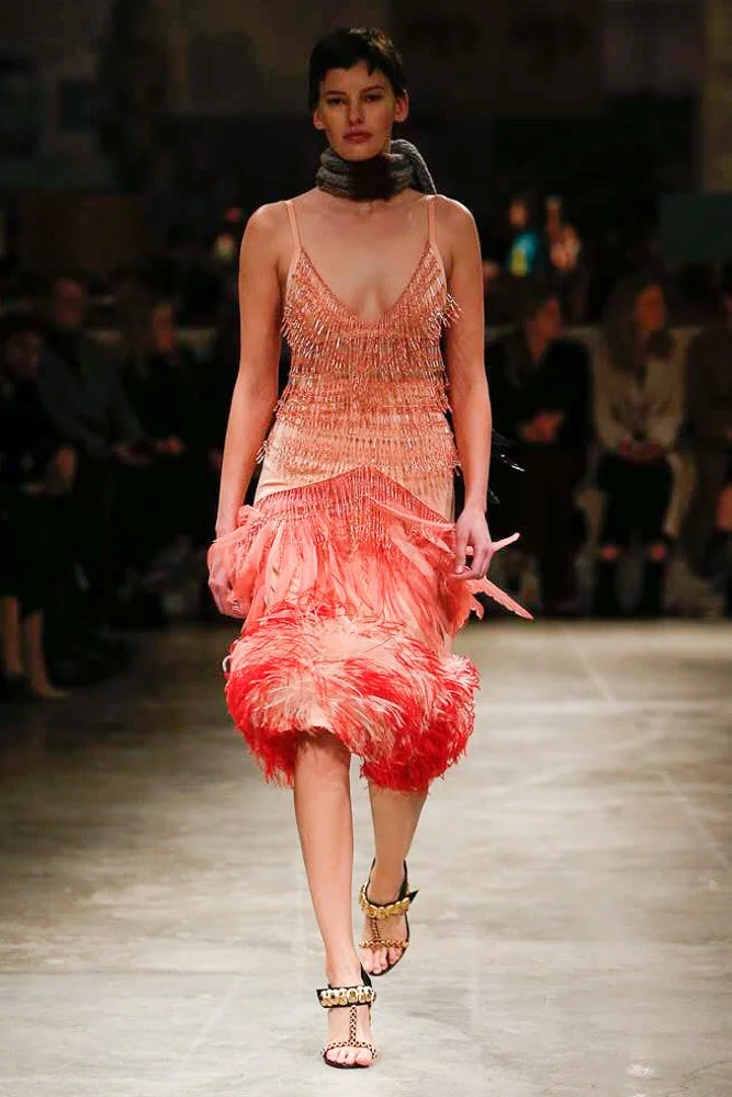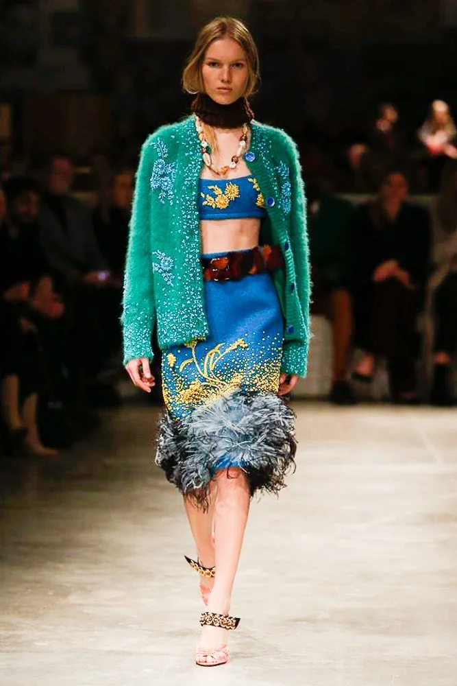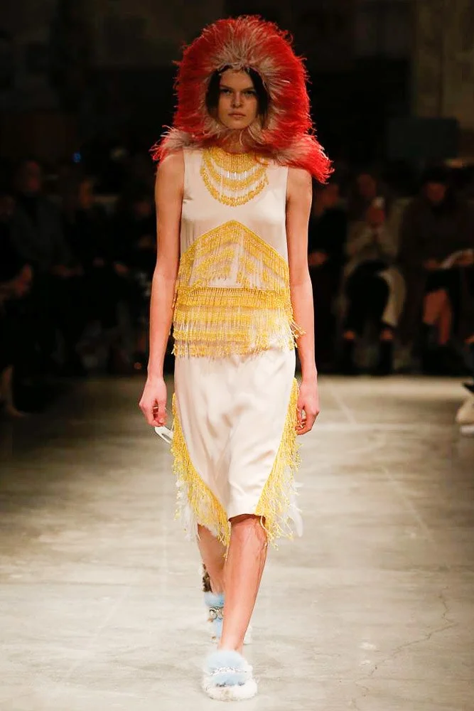 Miuccia Prada delivered her devoted following a fall/winter collection emblematic of her signature take on artful dressing. From beaded fringes that adorned a series of flapper-style dresses, to furry, hooded jackets and patchwork cardigans in an array of teals, ruby reds and canary yellows, bleak winter weather clearly doesn't call for uninspired winter dressing.